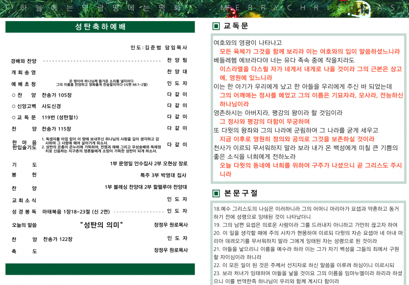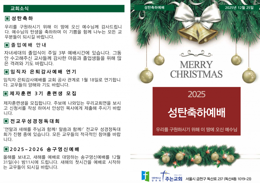 25-12-25 페이지 정보 작성자 주는교회 댓글 0건 조회 76회 작성일 25-12-25 08:24 목록 본문 이전글25-12-28 25.12.25 다음글25-12-21 25.12.19 댓글 0 댓글목록 등록된 댓글이 없습니다.
