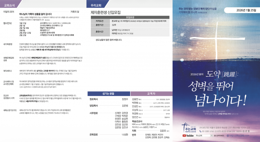 26-01-25 페이지 정보 작성자 주는교회 댓글 0건 조회 127회 작성일 26-01-24 13:32 목록 본문 이전글26-02-01 26.01.30 다음글26-01-18 26.01.16 댓글 0 댓글목록 등록된 댓글이 없습니다.